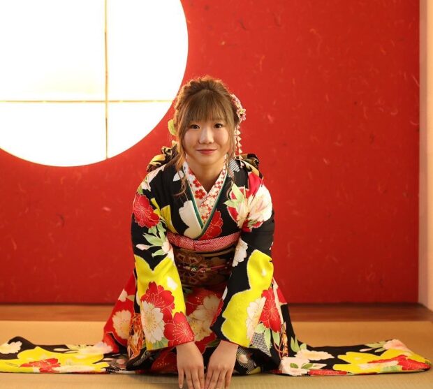 こちらは成人式の写真。鮮やかな色の振袖と可愛い半襟の組み合わせが良くお似合いですね。