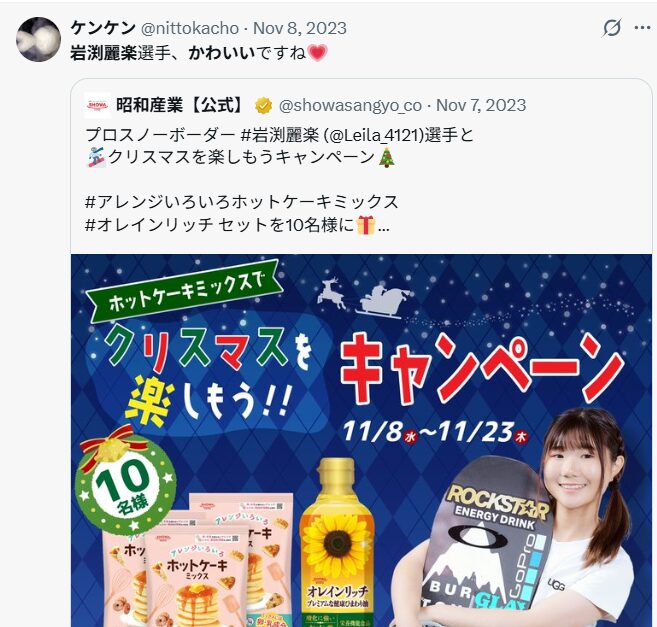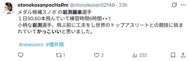 岩渕麗楽さんは、2022年北京オリンピックにおいて、斜め軸で後ろに3回転する難しい技「フロントサイド・トリプルアンダーフリップ1260」を女子で初めて成功させたことでも有名。